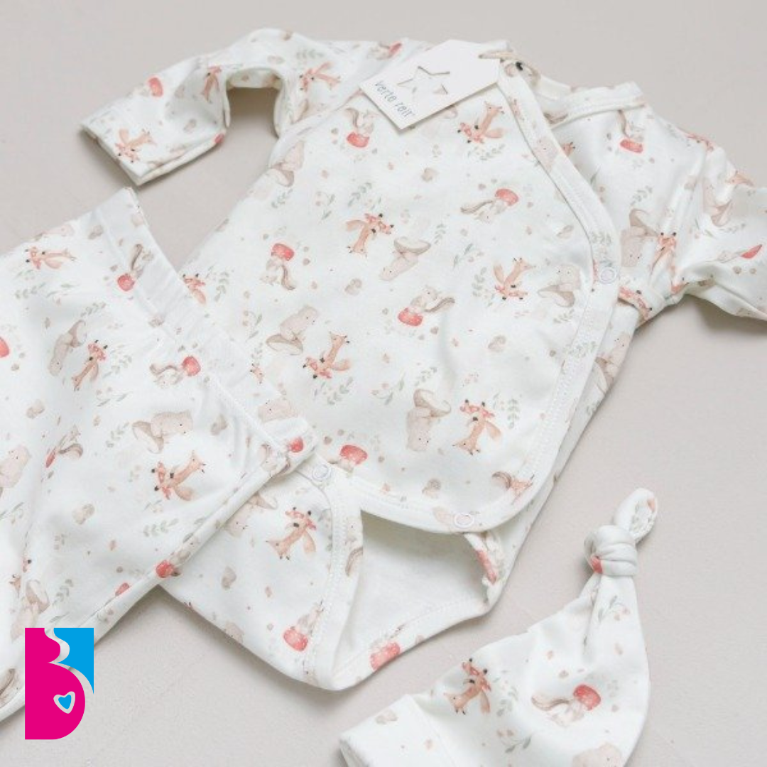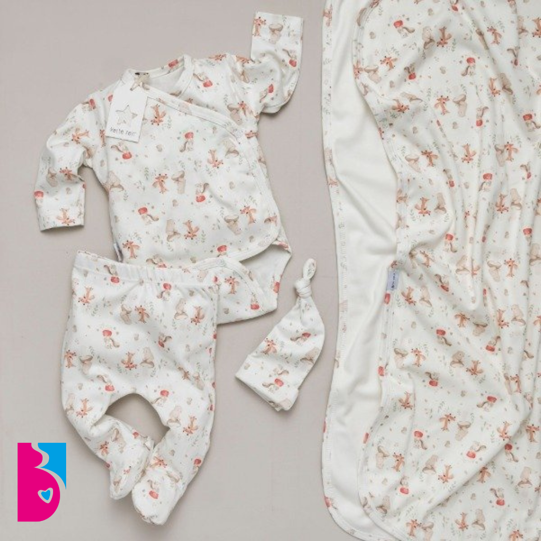 - Gorrito con nudo: Complemento perfecto para mantener la cabecita abrigada, confeccionada en algodón estampado, 100% pima.