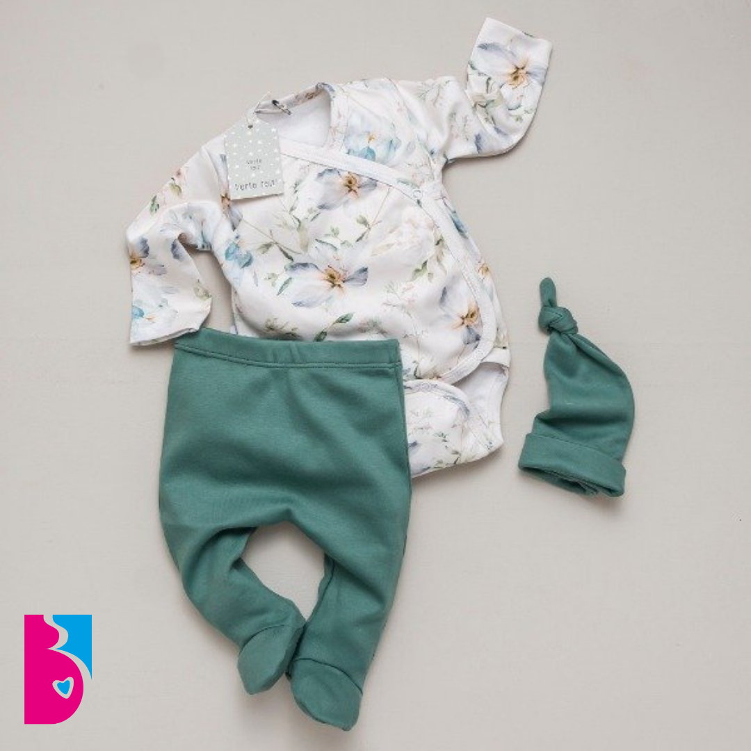 Completa el ajuar una ranita con pie y un gorrito con nudo, ambos en un delicado color ESMERALDA. Todas las prendas están confeccionadas en algodón peinado, asegurando la máxima suavidad y comodidad para la piel de tu bebé.