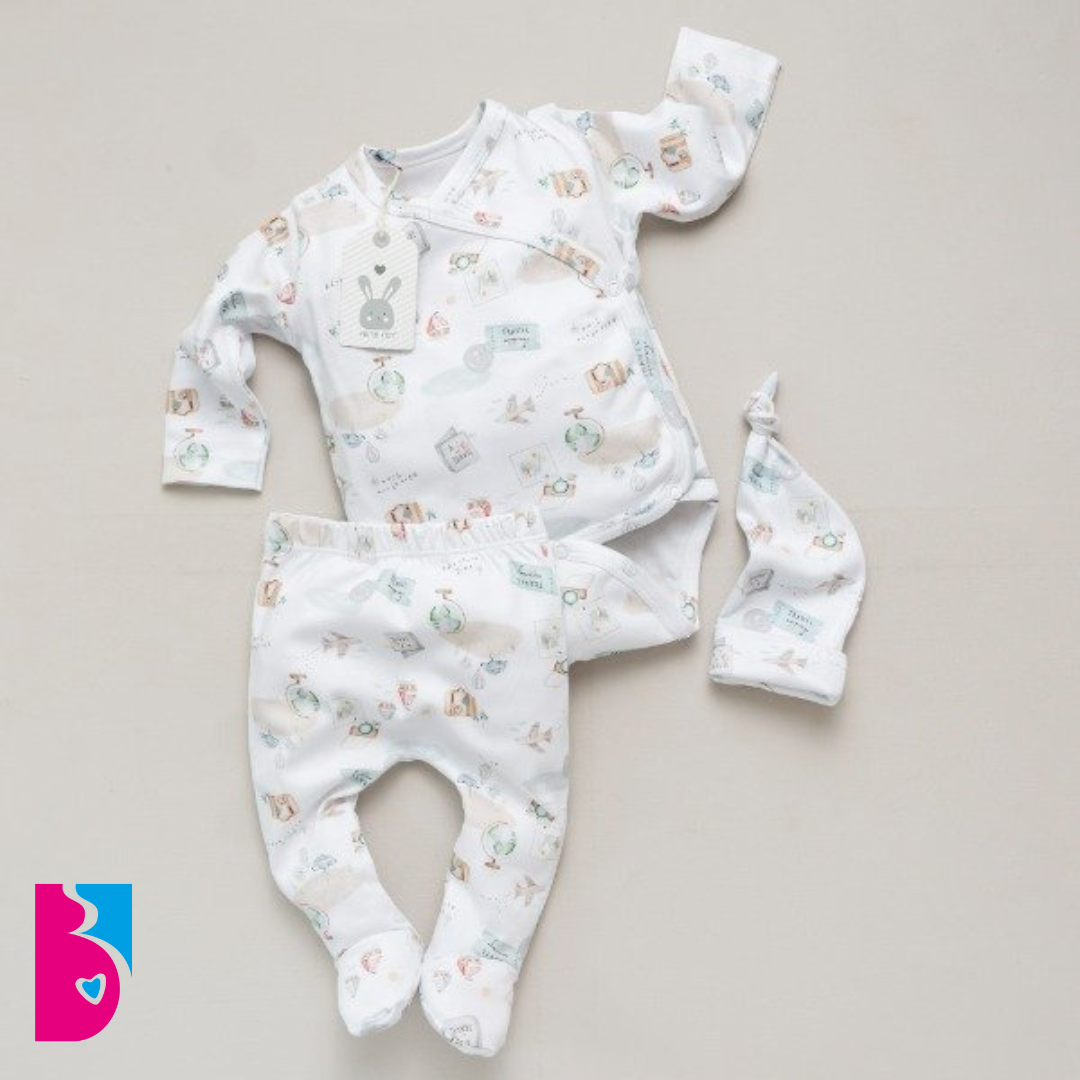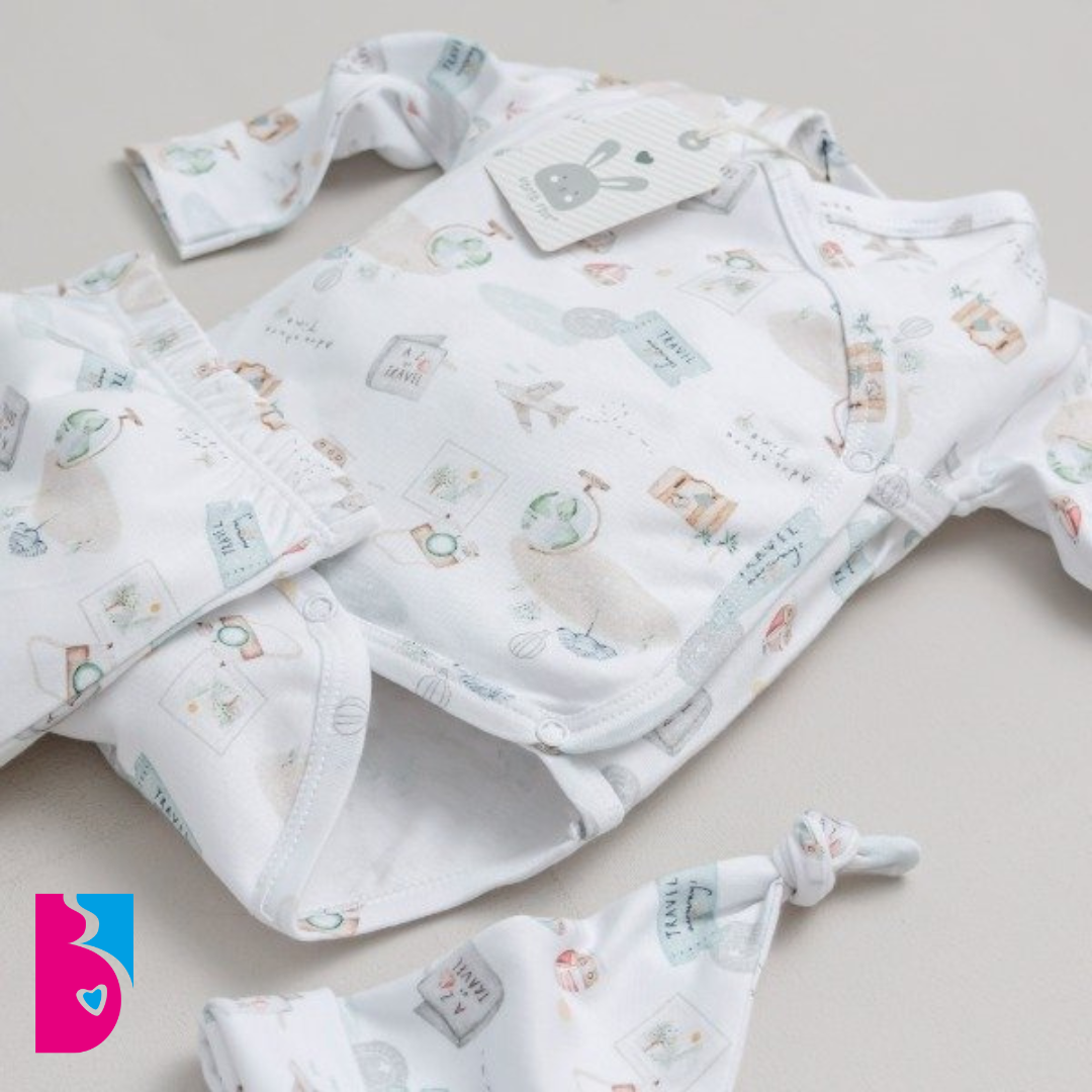 - Gorrito: Completa el conjunto con un gorrito con nudo, fabricado en 100% algodón peinado, utilizando la misma estampa.