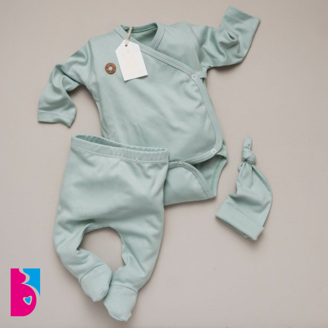 Éste mini ajuarcito es perfecto para los primeros días de tu bebé. El body cruzado o estilo oriental, es súper práctico para los primeros cambios gracias a su apertura total, que facilita el proceso al evitar manipular su cabecita.
