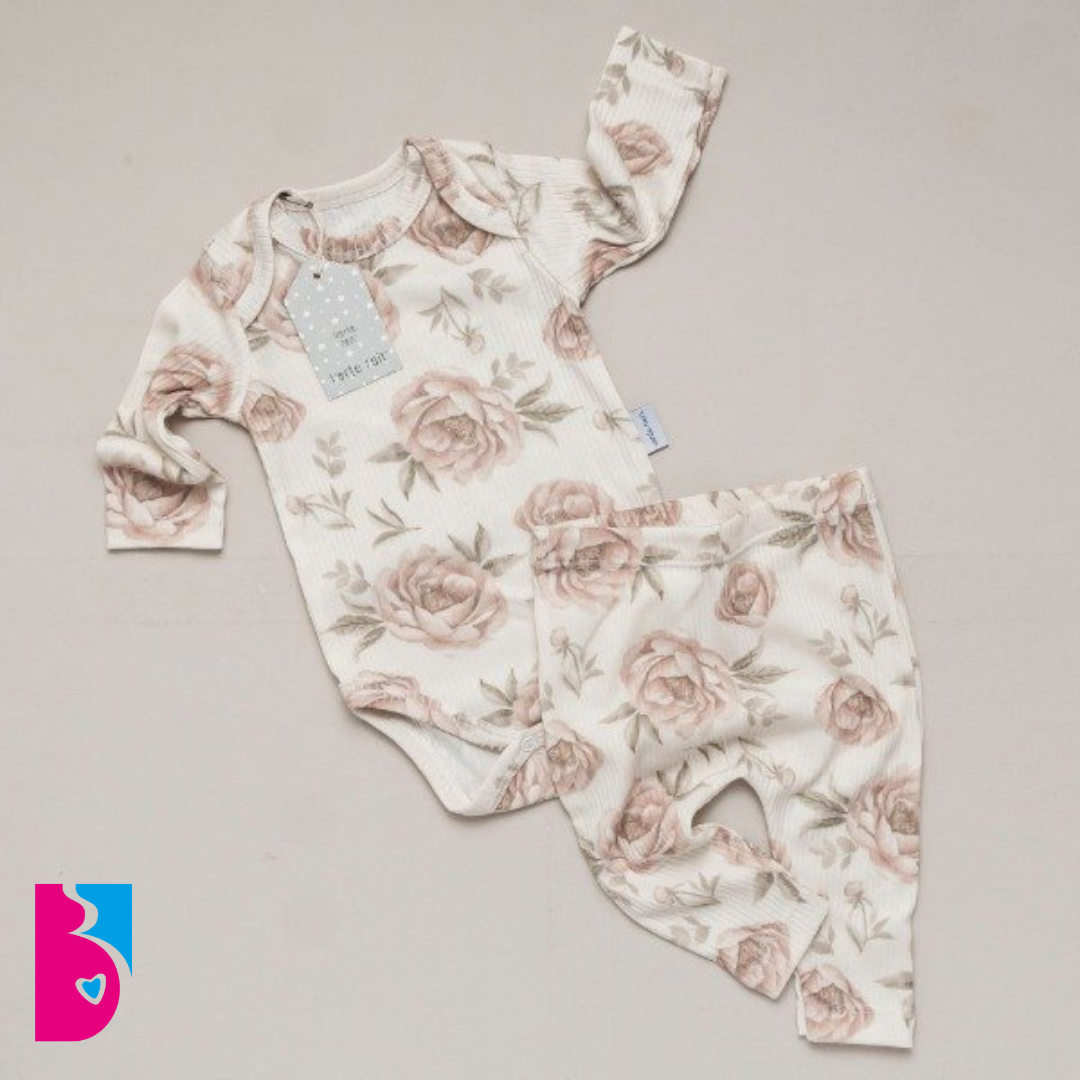 Este delicado set incluye un Body de manga larga con cuello americano y una babucha, ambos confeccionados en morley de algodón con lycra, lo que garantiza suavidad y comodidad para la piel sensible de tu pollito.