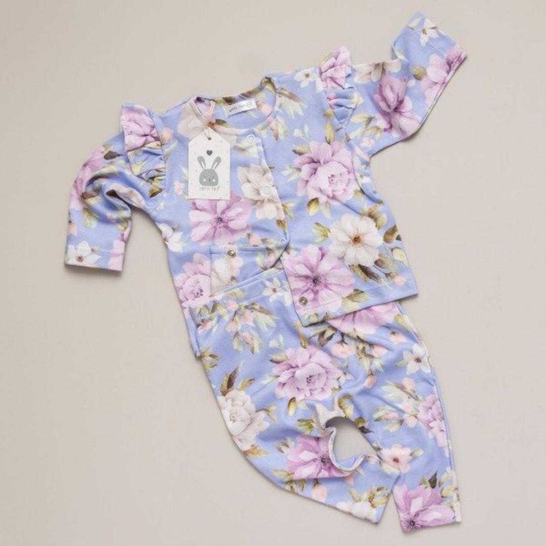 Éste adorable conjunto incluye un saquito y babucha en algodón pima estampado, pensado como un abriguito de medio tiempo, liviano y cómodo para acompañar ajuares lisos y usar en tardes frescas o en días fríos sumando un abriguito de piel como complemento. Es decir, un producto versatil y necesario en cualquier momento del año.