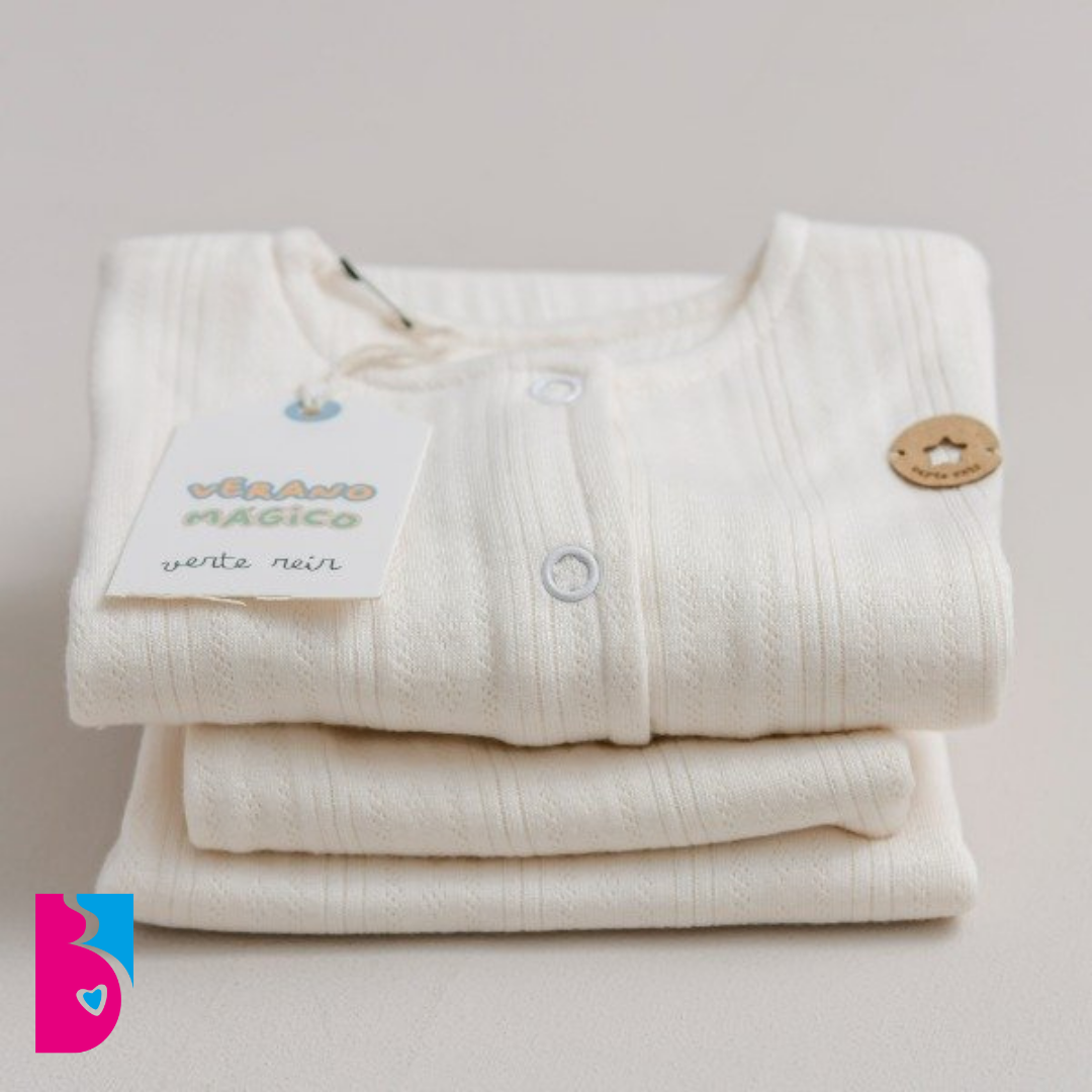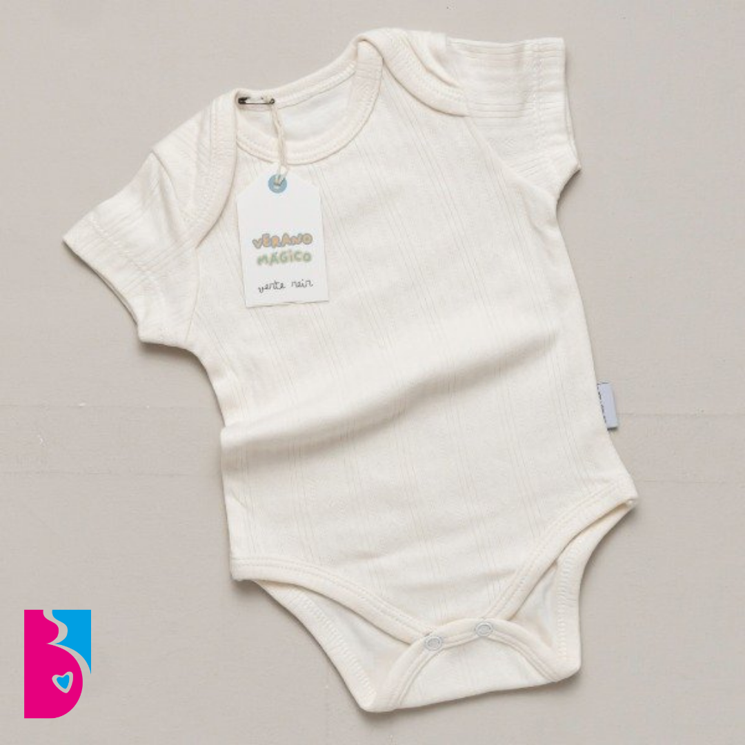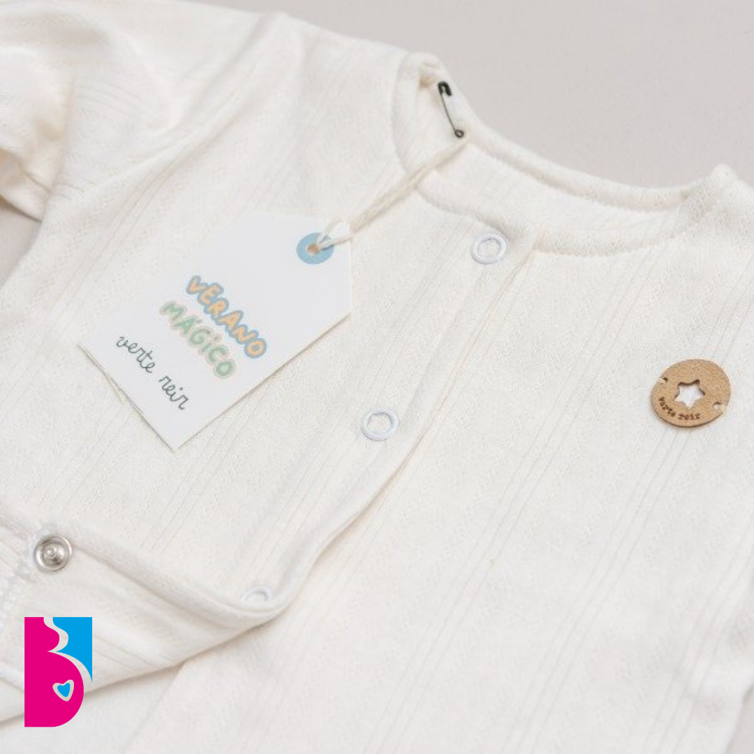 - Body de mangas cortas: Perfecto para nacimientos en épocas cálidas, permitiendo combinarlo con el saquito o sumar un abrigo si es necesario.